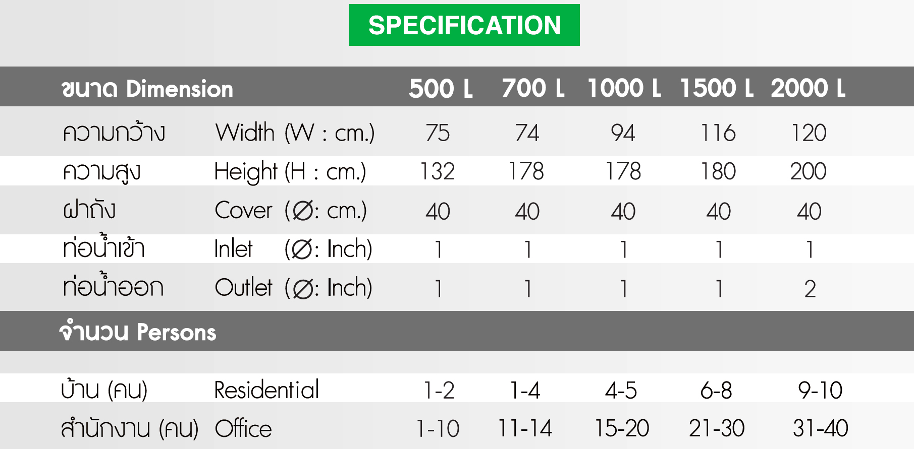 2. รุ่น (ลิตร) 500 ,700 , 1000 ,1500 ,2000