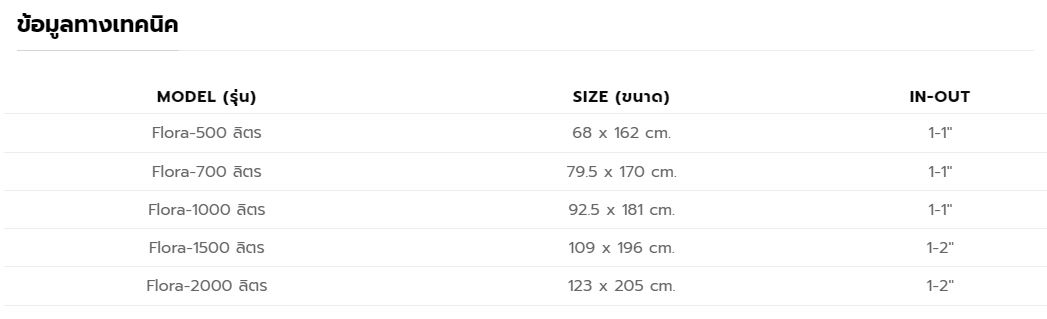 12.ขนาด : ถังน้ำ 500 ลิตร, ถังน้ำ 700 ลิตร, ถังน้ำ 1000 ลิตร, ถังน้ำ 1500 ลิตร, ถังน้ำ 2000 ลิตร