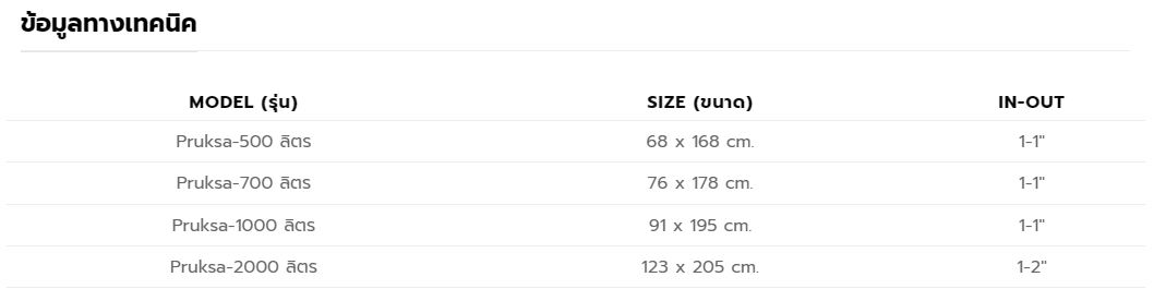 12.ขนาด : ถังน้ำ 500 ลิตร, ถังน้ำ 700 ลิตร, ถังน้ำ 1000 ลิตร, ถังน้ำ 2000 ลิตร